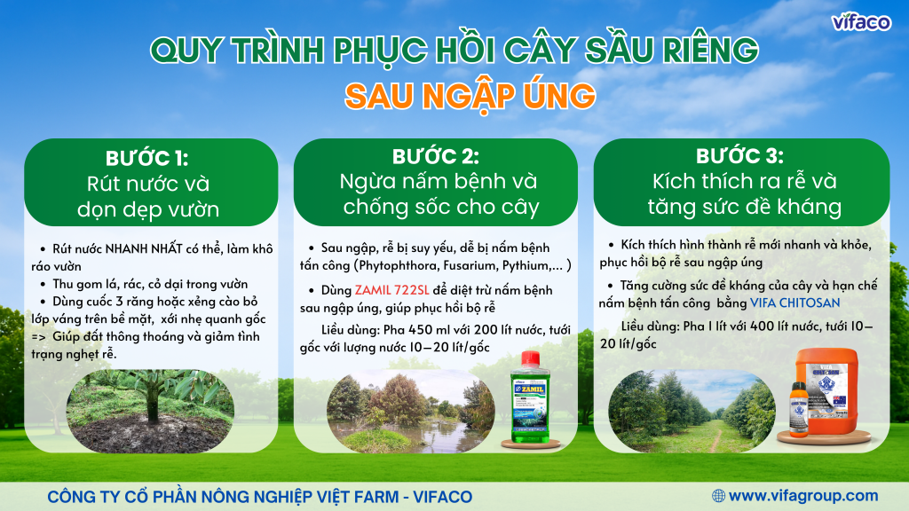 Vì vậy, cần xử lý nhanh – đúng kỹ thuật để giúp cây phục hồi sớm, hạn chế thiệt hại. Dưới đây là Quy trình 3 bước phục hồi vườn sầu riêng sau ngập úng của Công ty Vifaco bà con cùng tham khảo: